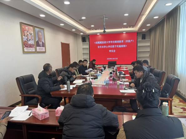 2025年12月12日下午,学校学位委员会在行政楼601会议室召开专题会议,审议《西藏藏医药大学学历继续教育(非脱产)专升本学士学位授予实施细则》。会议由校党委委员、副校长、学位委员会副主任边巴仓决主持,全体学位委员会委员出席,秘书多杰加负责会议记录。