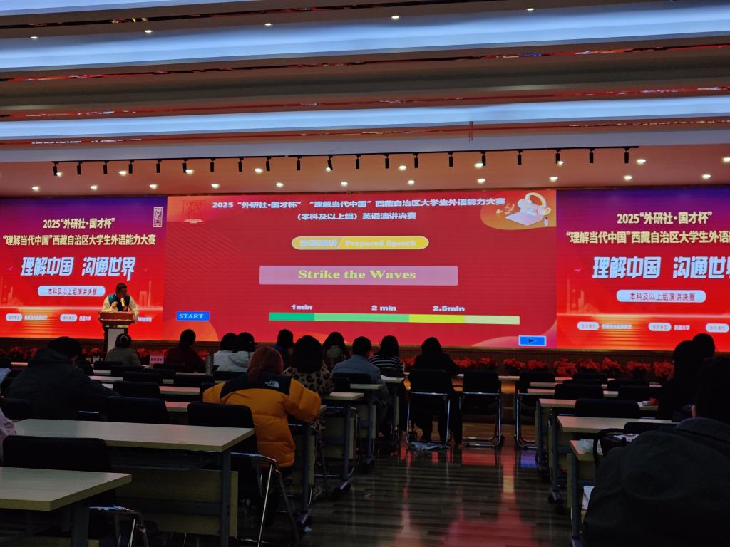2025年11月1-2日由西藏自治区教育厅主办的2025年“外研社·国才杯”“理解当代中国”西藏自治区大学生外语能力大赛决赛在西藏大学举行。参与决赛的学校为西藏各高校具有高等学历教育招生资格的普通本专院校在校专科生、本科生、研究生(不包括在职研究生)。基础部主任翟新然副教授代表学校参加颁奖典礼。本次比赛分本科及以上组与高职高专组两个组。我校带队教师为语言教研室英语组次仁旺堆副教授,经前期校赛选拔出9名同学进入本次省级本科及以上组笔译和演讲决赛,参赛选手均为各高校英语专业和非专业选手。经过激烈角逐,我校学生获得了优异的成绩。其中获得金奖的丹增诺布同学有望代表西藏大学生参加在北京举行的全国国赛。